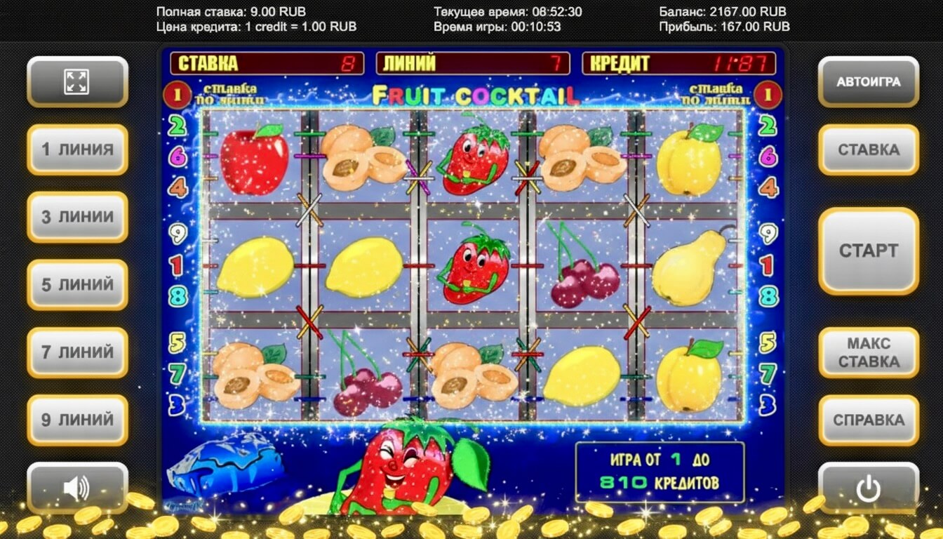 Чтобы начать играть Fruit Cocktail демо, обычно даже не требуется регистрация в казино. Просто находите на сайте слот, нажимаете кнопку «Демо» или «Бесплатно», и вуаля — на вашем счету 1000, 5000 или 100000 виртуальных монет.